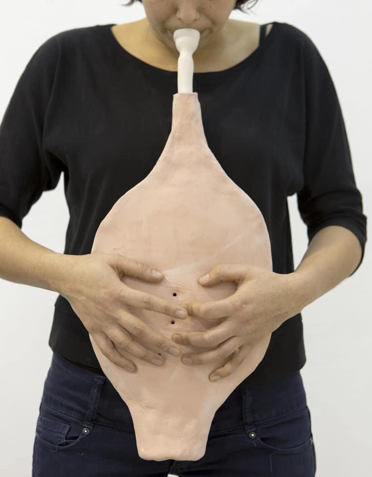 Her first exploration of sound came during a period studying in Geneva under the Erasmus programme, when she had to find a project for a ceramics workshop. Already an experienced trumpet player, she decided to create ceramics that could be played like instruments, and which would enhance the experience of those playing them, in particular by channelling vibrations. These ‘sound objects’ in fired clay included a horn that curved around so that its mouth pressed against the player’s stomach, directing the sound and vibration back into the body. Another doubled this experience, with interlocking horns for two people to play. Still, another had a bulging clay body that had to be played clutched in an embrace.