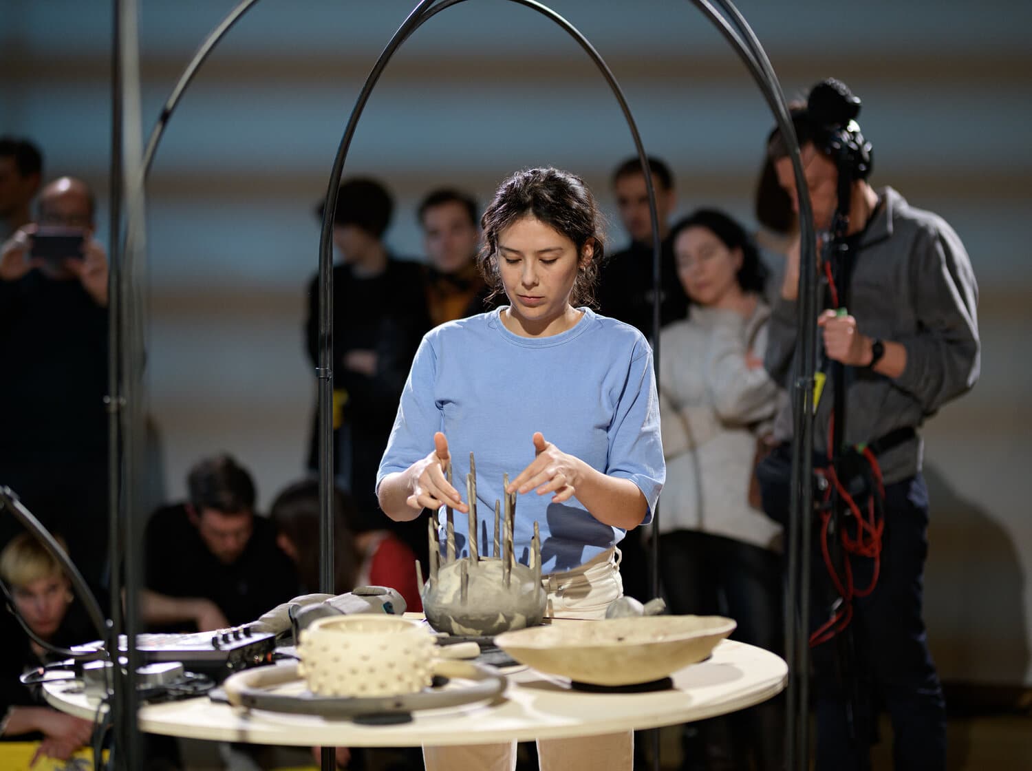 Maika Garnica (b.1992) translates form and material into sound, building objects in clay and playing them to produce atmospheric soundscapes. Some of her objects resemble traditional musical instruments, others are more abstract, playable sculptures that produce sound when blown, scraped or struck. In performance, her installations turn into exotic orchestras.