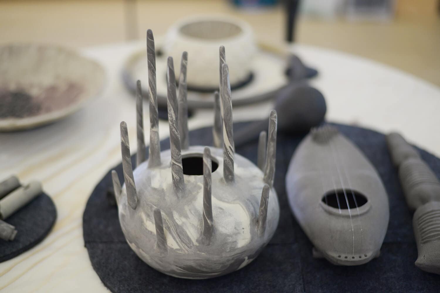 This experiment was a success, up to a point, but turned out to have limitations. In particular, people were reluctant to play with the objects, fearing their fragility. So the ceramics that Garnica made next focused on sound and vibration in a more conventional way. She researched instruments from different periods and cultures, paying particular attention to how the forms related to the sounds they made, and the effects produced by small variations in form.