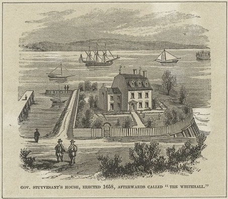 A nineteenth century romantic-style rendering of “Gov. Stuyvesant’s house, erected 1658, afterwards called the Whitehall,” included in Mary Louise Booth, History of the City of New York (1867)© The New York Public Library