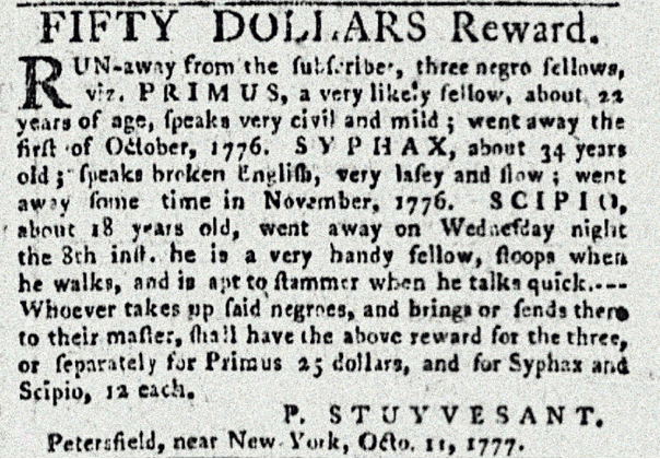Though Mayken van Angola and other free Black people lived out their days in the bowery community, the village and the colony remained served by the forced labour of enslaved people. In later generations when the bowery was rented out, it was sold along with the labour of two enslaved men named John and Samson. In the middle of the eighteenth century, eight enslaved people—Gansey, Dick, Syphax, Primus, Scipio, Peg, Mary and Lucy—who lived and toiled there were passed down by Gerardus Stuyvesant to his sons Petrus and Nicolas. Three of them, Syphax, Primus and Scipio would run away only to be pursued in the local papers by Petrus Stuyvesant, the former Dutch leader’s great-grandson.