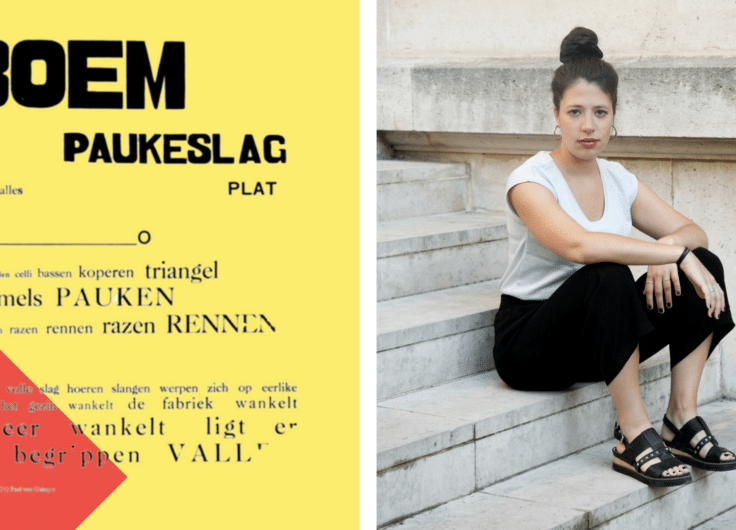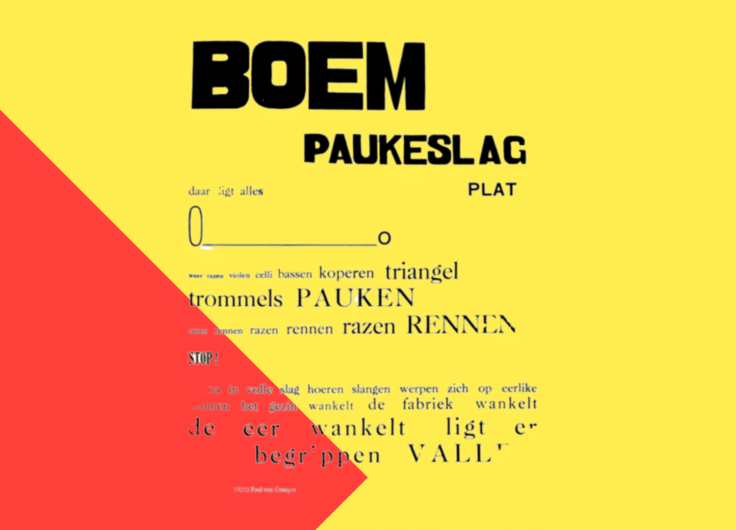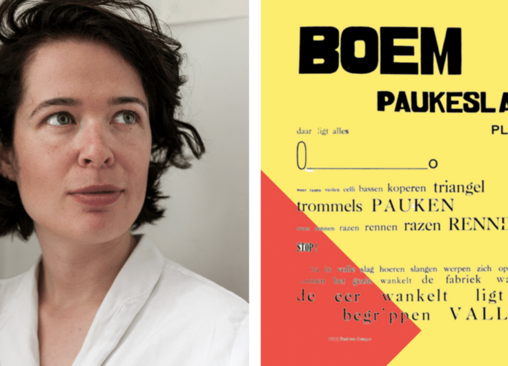 She is talking about Boem Paukeslag (Boom Kettledrum), Paul van Ostaijen’s iconic poem from his collection Bezette Stad (Occupied City), which was published a hundred years ago. What most readers of the poem remember is the striking typography, a welcome way in for lethargic teenagers. BOOM! says my teacher, we jump, look, she says, that’s what Van Ostaijen wanted. We mustn’t be lazy about reading, we must be alert! Rush run rush run rush RUN! Isn’t it unbelievably funny? Words that climb over a page like acrobats, sentences that roll and drum, the word zeppelin in the shape of a zeppelin, it’s all possible, it was all possible, it’s virtuoso stuff!