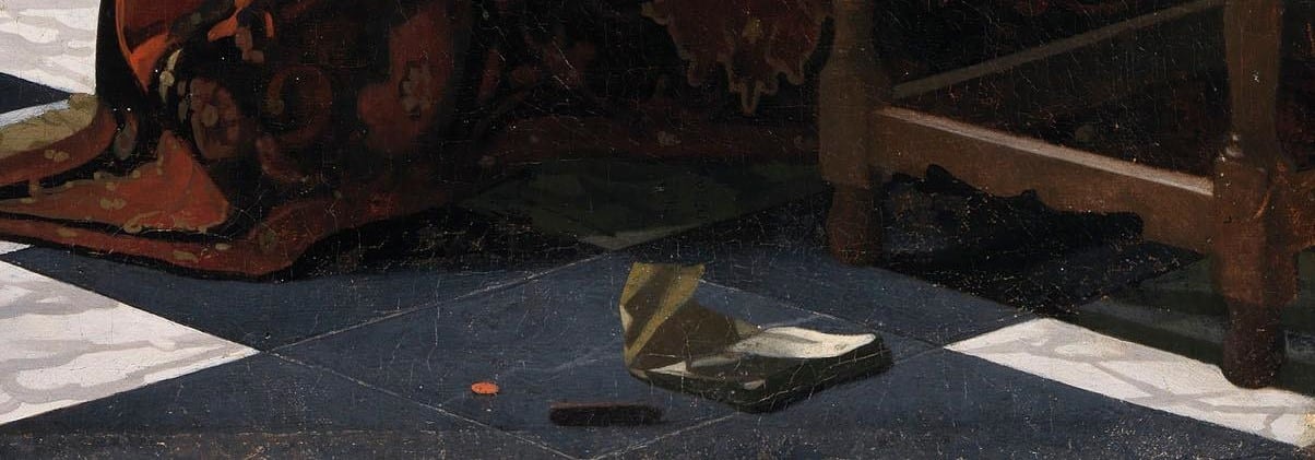 She sits there, at the table, on the edge of the image and yet in the centre of the composition. A warm-red carpet with colourful patterns covers the table. There is a chair in front of the table, upholstered in blue, and not pushed underneath. On the black-and-white tiled floor, there is a crumpled letter and a broken wax seal. Behind her we see the maid, staring outside through the stained-glass window. Nearly the entire wall in the background is taken over by a large painting. I can’t quite make out the scene, but the catalogue helps me – it is Moses who has been found in his bulrush basket. To the left, over the full length of the room where we find ourselves with these two women, a dark curtain is pushed aside by an invisible hand.
