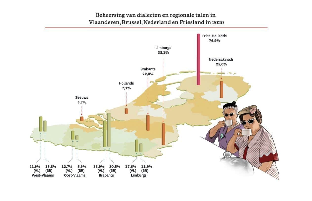 In social settings, dialects and regional languages are used more often in Flanders than in the Netherlands, but on social media and in professional settings they are used less often.