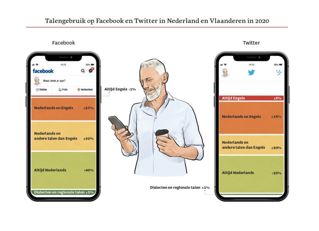 In the Netherlands and Flanders, dialects and regional languages are used even more on Facebook than on Twitter, while people more often opt always to use English on Twitter than they do on Facebook.