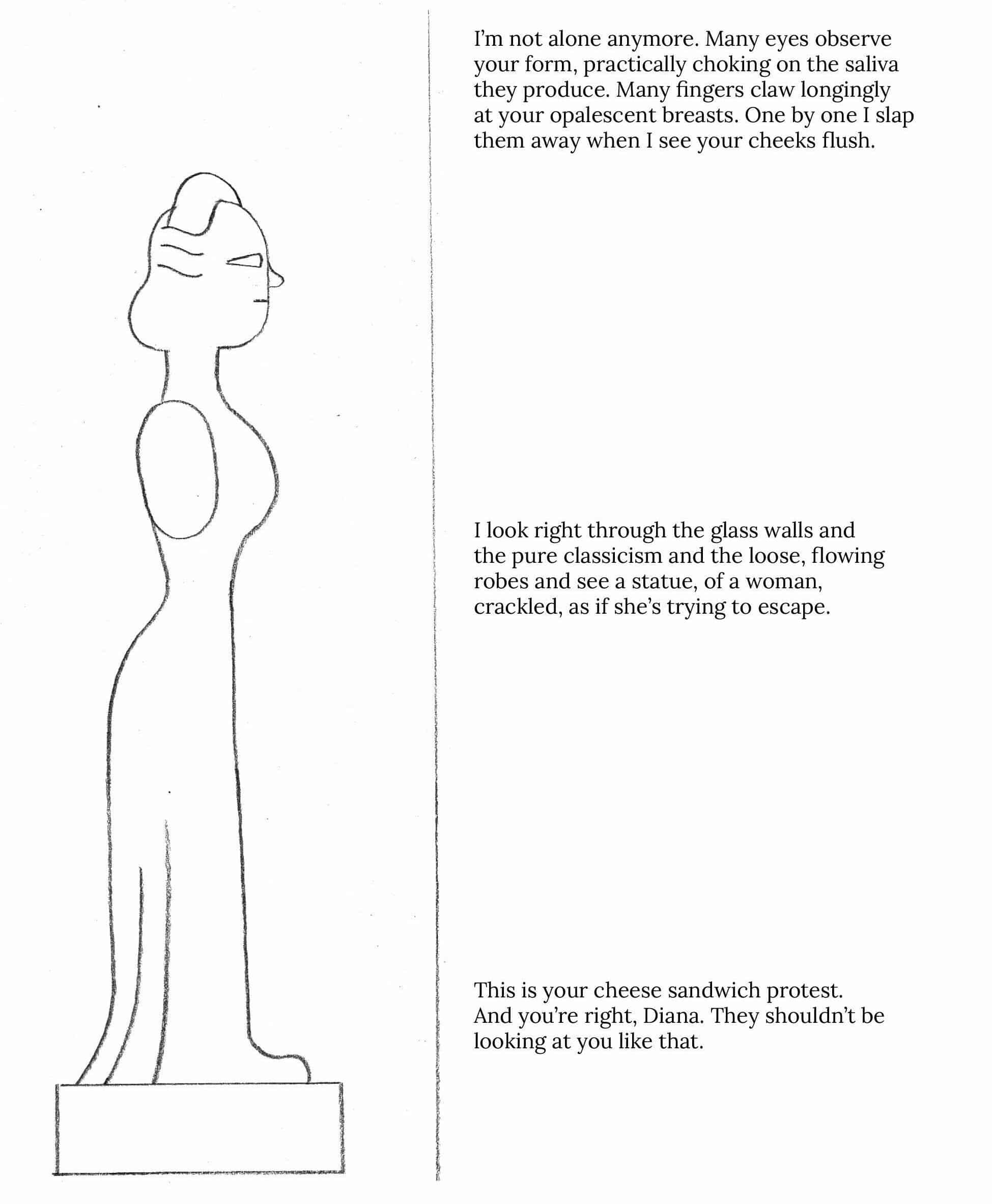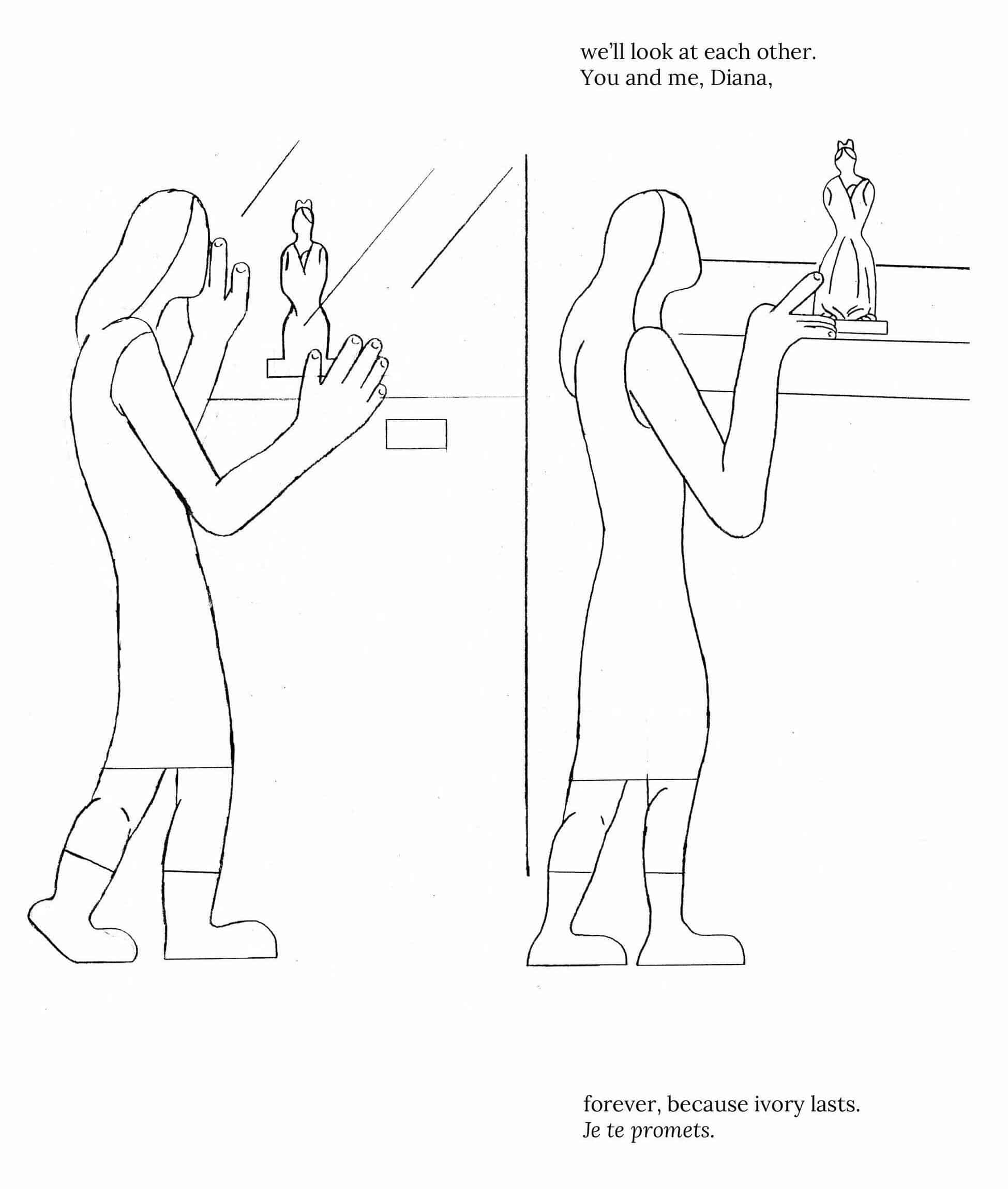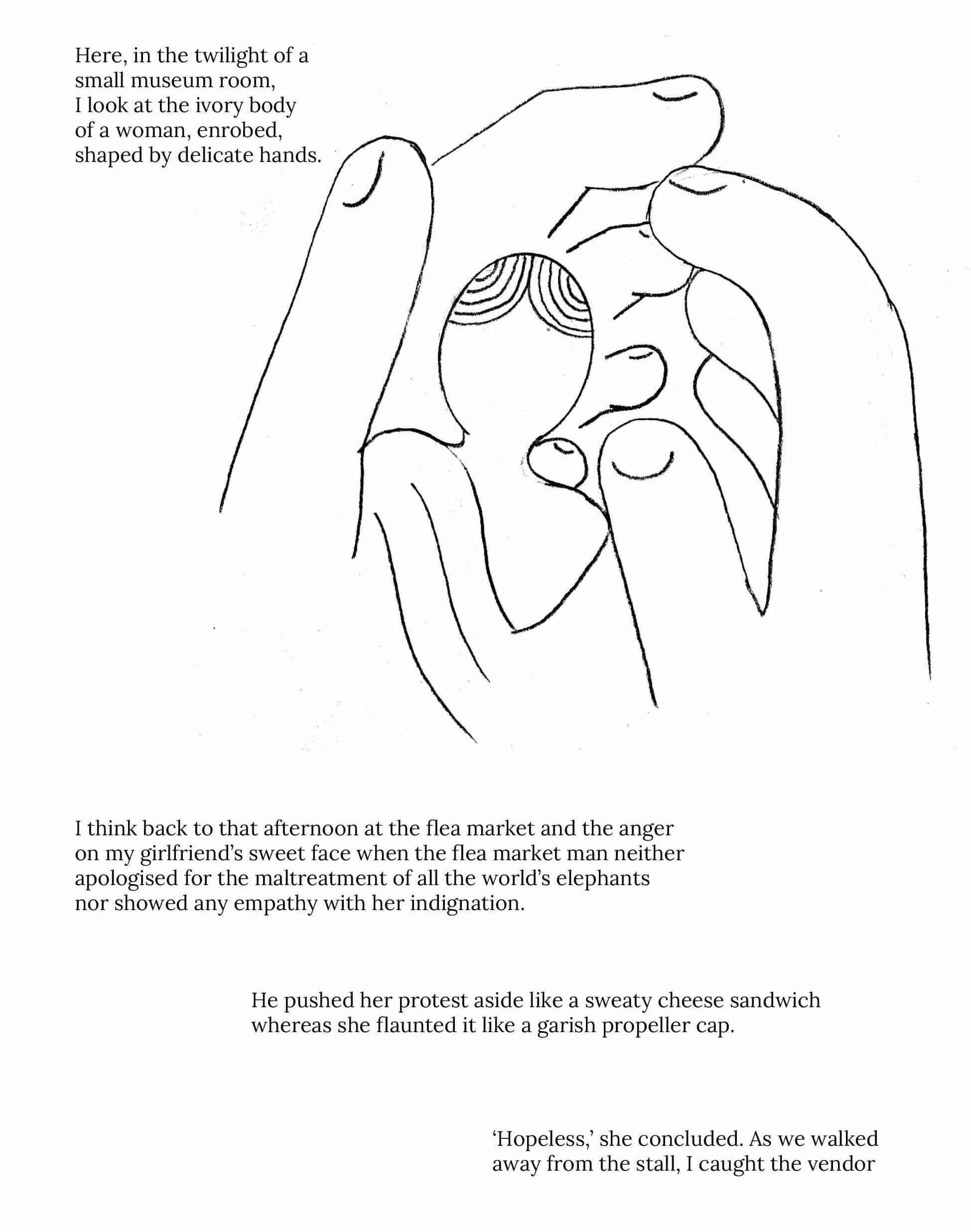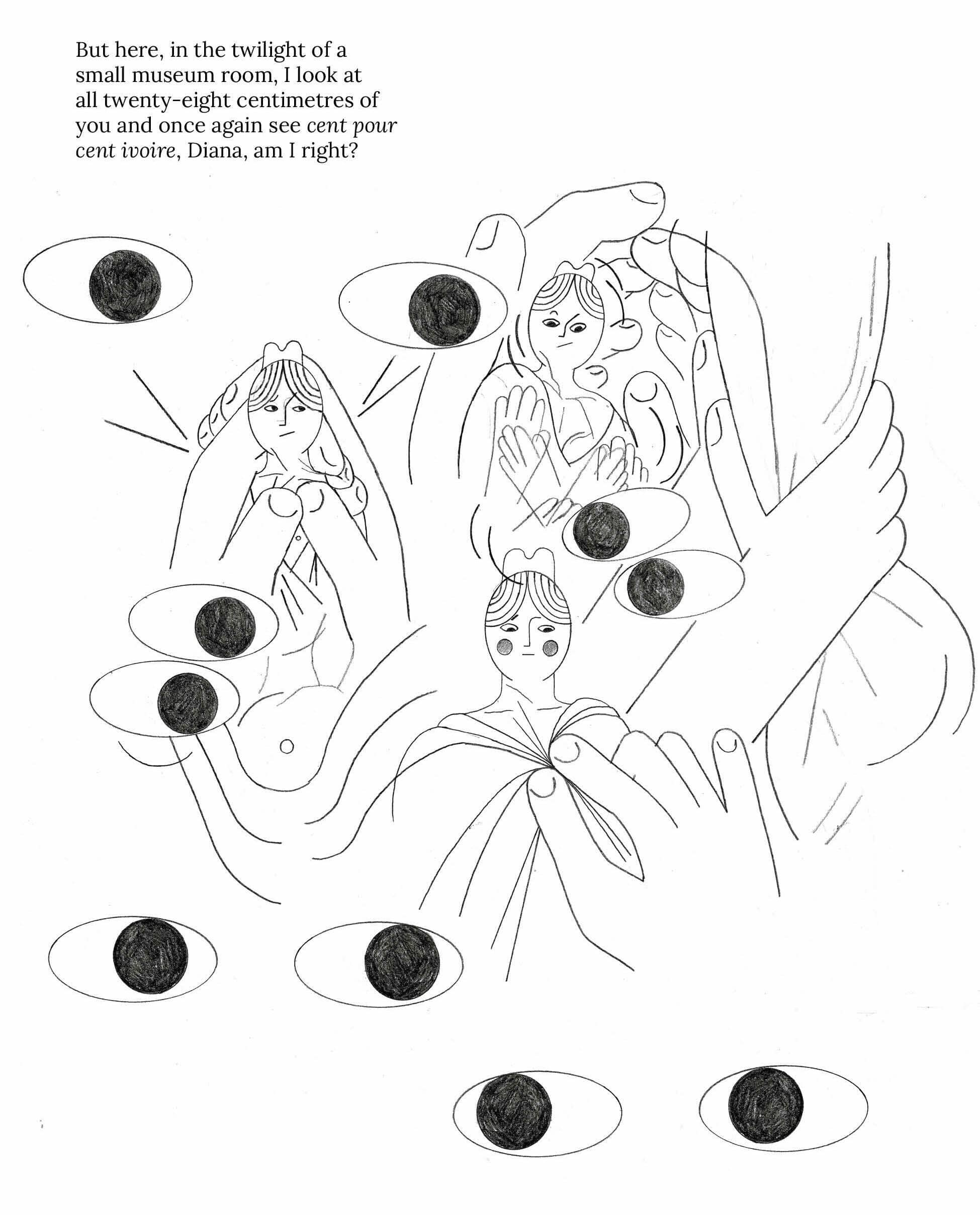 Eighteen young Flemish and Dutch authors have taken inspiration from seventeenth-century artefacts from the Rijksmuseum. Looking at these objects, what eureka moments do they see? Sara Mertens created a graphic story in response to an ivory statue of what is thought to be Diana, made by Jean Goujon. ‘[I] see a statue, of a woman, crackled, as if she’s trying to escape.’