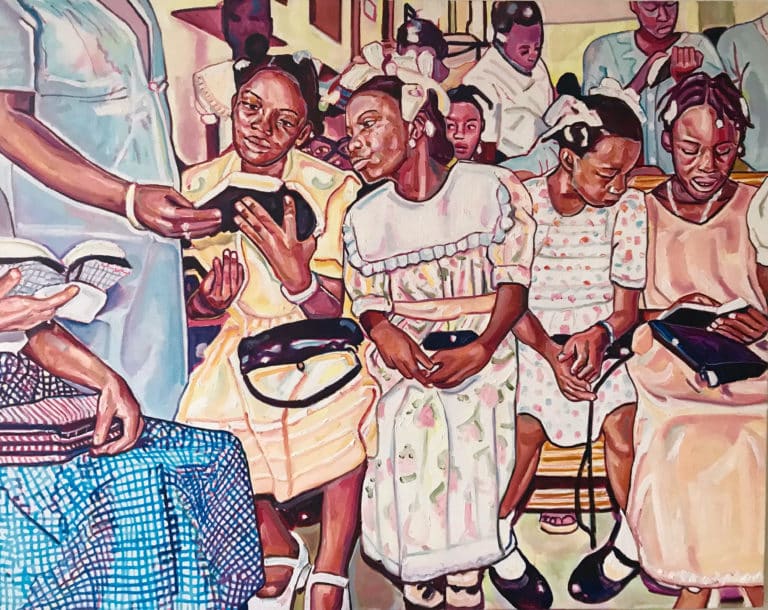 Esiri Eheriene-Essi, The Rituals, 2018, oil on canvas, 170 x 135 cmEsiri Erhiene-Essi’s (1982) figurative paintings are colorful depictions of everyday life that unravel implicit commentaries on society and history. Her tableaux incorporate images, objects and documents from her personal archive to voice and render visible forgotten or unseen historical narratives. Her paintings offer new readings of history by combining traditional painterly styles with a modern understanding of society. The jury appreciates the richness and complexities of the artist’s paintings and her ability to activate and engage with urgent socio-political issues in a subtle way.