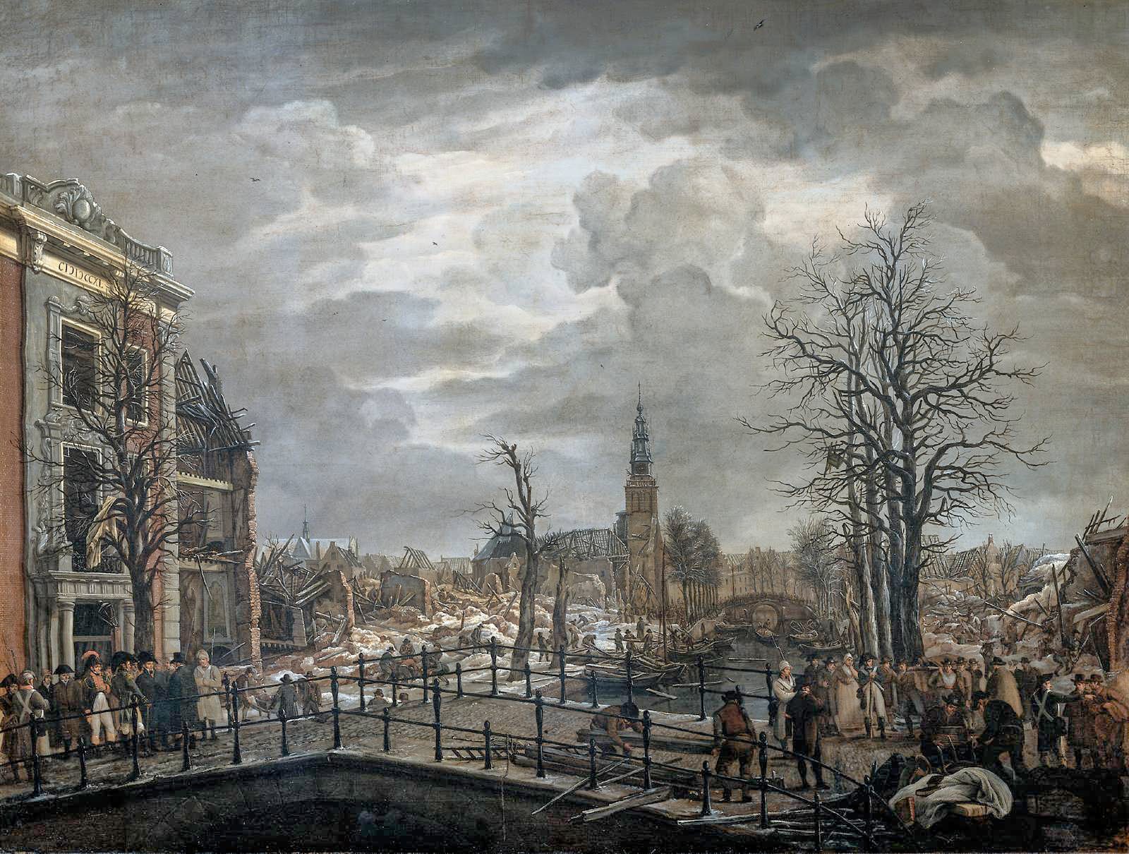 On 12 January 1807, a ship carrying 37,000 tons of gunpowder exploded in the middle of Leiden. It was a national disaster: 150 people died and many houses were destroyed. King Lodewijk Napoleon, here on the left among the Leiden administrators, visited the disaster site three days after the explosion.© Rijksmuseum, Amsterdam