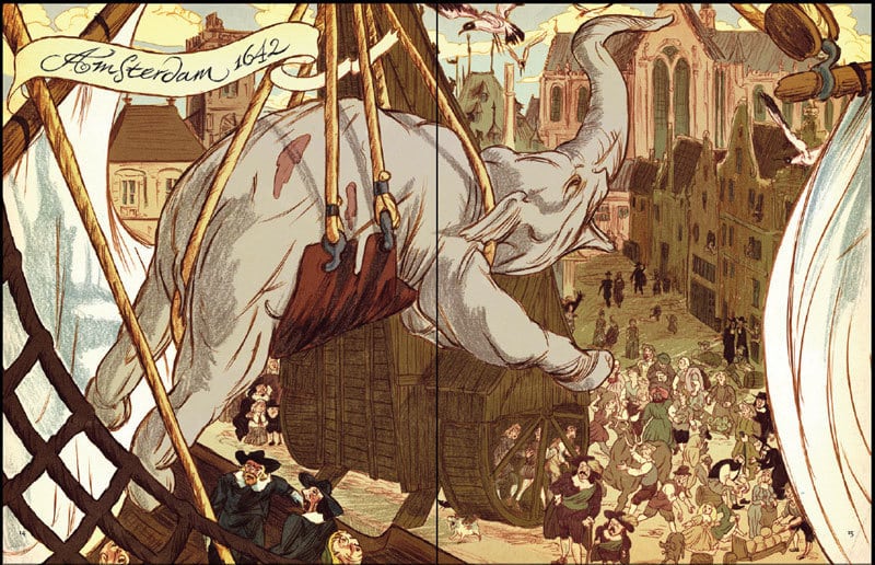 The virtuoso illustrations also reveal the grimy, stolid quality of Rembrandt’s work. Take for instance the scene in the second chapter, in which Rembrandt seeks backing for the “operetta characters” of the militiamen, also known as “the night watch”. You know the ones, that painting we were talking about before. He turns up there, with brisk reluctance, among a clutch of carousers. The drunken, grotesque mugs of the company are so theatrical that it’s as if as readers we have landed in a cabinet of pickled curiosities. It’s almost as if Rembrandt himself has drawn a cartoon; it’s no coincidence that Typex has taken many of Rembrandt’s own images as starting points. What is Typex’, and what is Rembrandt’s, we wonder from time to time. Whatever the answer, the book was showered with prizes and soon found its way into other languages.