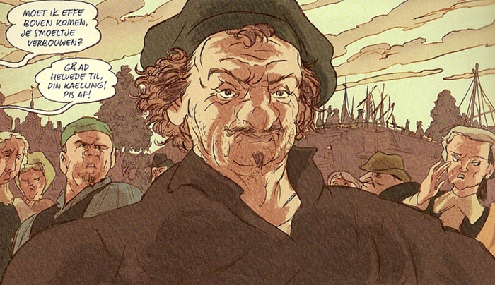 Due to such limited sources, Typex opted to sketch each of the ten chapters on another figure from Rembrandt’s life: his wife and son Titus, as well as unknown characters – one of the chapters even revolves around a rat. This is Rembrandt through the eyes of others, not least those of Typex himself, who also worked on his own ideas and impressions in order to get the story moving. ‘Biographies can’t lie, but I can,’ he has said several times. Hence also the title: Typex’ Rembrandt. This was his version of the famous artist’s life. ‘He was a very complex person. And a prick.’ And so it is: in Typex’ eyes Rembrandt is irritable, rude, vain, mean, stubborn and sentimental. But also endearing and sometimes even pitiful.