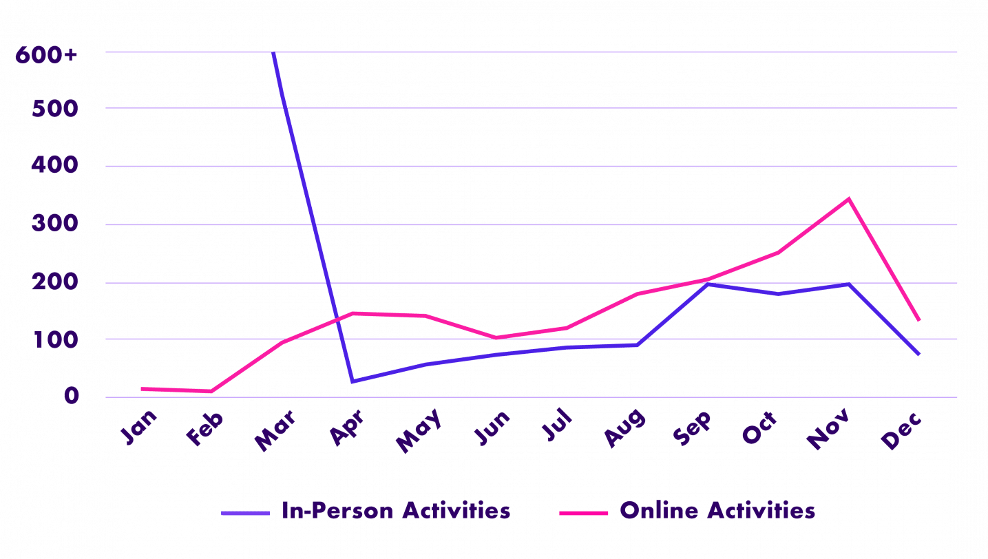 Roughly 20% of activities in 2020 were online. The timeline below shows that immediately as the pandemic hit artists and cultural organizations adapted by moving activities online. By April 2020, online activities surpassed in-person activities and continue to rise steadily. Both online and in-person activities drop sharply in December 2020, likely due to a combination of the second wave of the pandemic as well as the slow-down of winter holidays.