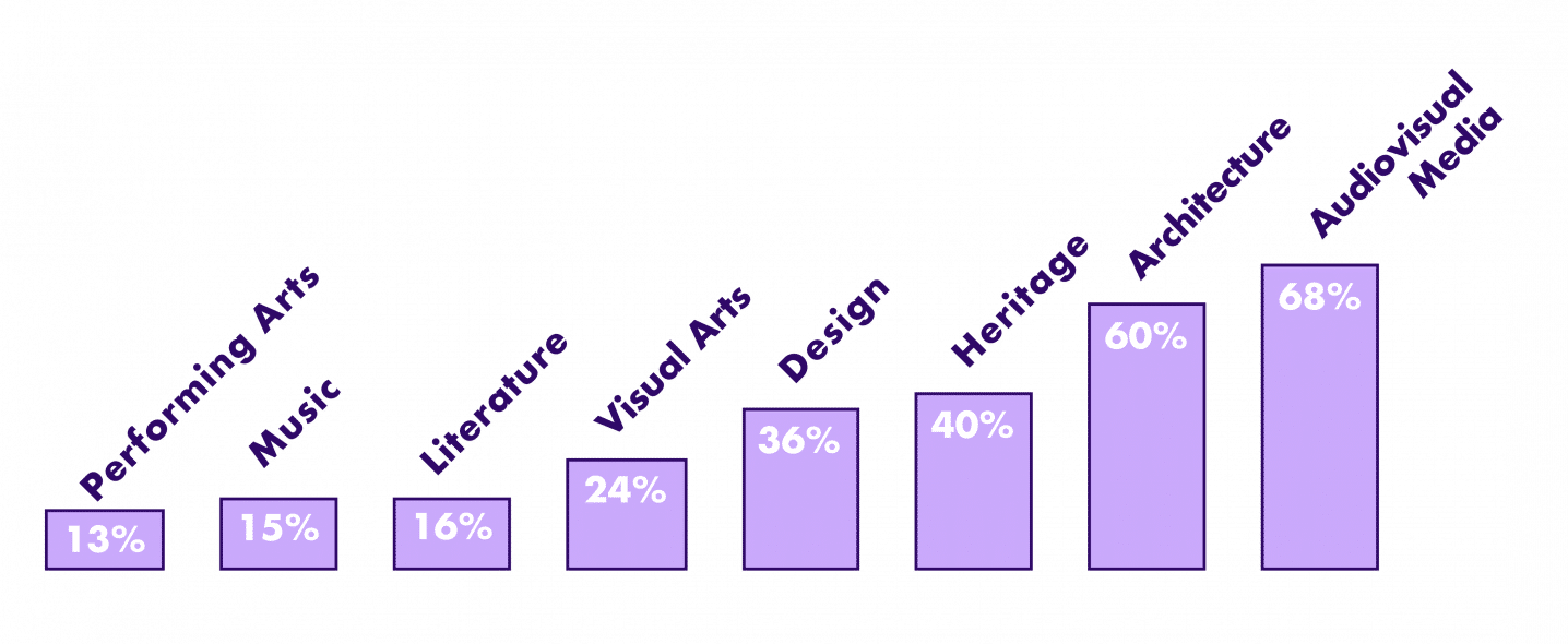 Not all disciplines were equally able to adapt to online formats. Only 15% of music activities were online, and only 16% of performing arts activities. On the other hand, audiovisual media was able to adapt much more readily and, as a result, 68% of audiovisual media activities were online in 2020.