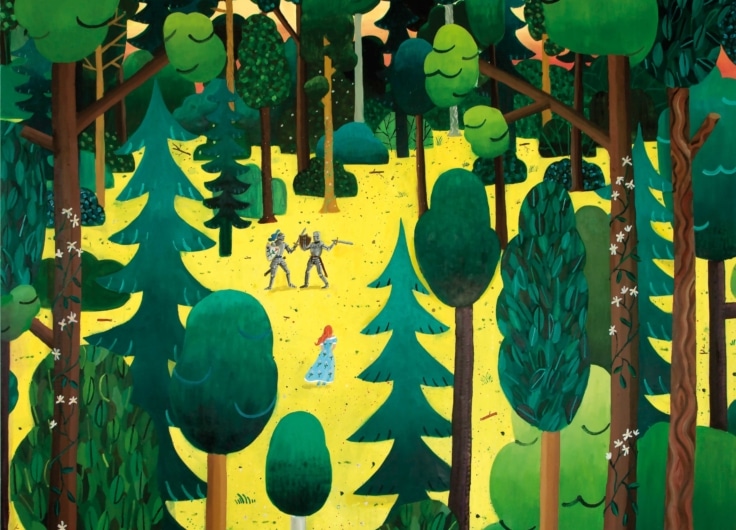 What matters isn’t that we recognise the turtle sitting in the lap of a lady, as depicted in Our Short Lives, but that we enjoy the totality that is brought about by the many natural phenomena and references to ancient stories. The painting is primary: Demunter is not interested in writing a new epic or twenty-first-century iconography. The many details in his works are not premodern analogies that (like the mediaeval ambience in some of his paintings may give cause to suspect) like symbols, refer to a kind of transcending deity, overarching idea, or generalizing statement.