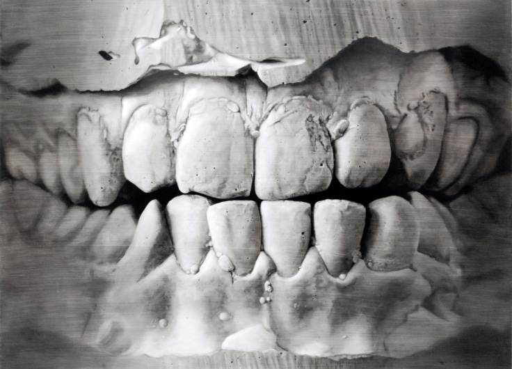 Similarly, his paintings are preceded by a period of intense research, during which he combs his way through references, scientific studies, and Wikipedia entries omnivorously. Even his studio (a former tax office in Temse) gives evidence of this diverse interest: recently Demunter felt compelled to store his wide collection of found rocks, keys, and fossils collected on walks in labelled boxes.