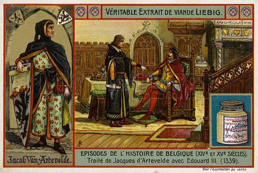 Agreement of a treaty between Jacob van Artevelde of Ghent, and King Edward III of England, 1339. Liebig card, from a series on episodes from the history of Belgium in the 14th and 15th centuries, published in late 19th or early 20th centuryAs we mentioned earlier, Van Artevelde’s main priority was re-starting the trade to England. He fostered great relations with the English King, Edward III, who sailed with his navy to dock at Sluys, near Bruges. From there he could conduct his war against the French. Froissart tells us how there were many meetings between Artevelde and the King, and the various representatives of the cities. Through giving him loans, Artevelde was able to negotiate an end to the embargo on the export of wool from England to Flanders, as well as Edward’s vow to take back the towns Flanders had lost to France over the last century. Edward’s main priority was to find allies to fight the French. Van Artevelde knew that, despite having a revolutionary regime in charge, the Flemish still valued the oaths they had sworn to the French crown, and would suffer retributions from the Church as well as shame and dishonour if they were to turn against their suzerain. But if Edward was to be crowned as King of France, this would release the cities from any obligation they had to Philip. So, on the 26th of January, 1340, Edward III entered Ghent and, in great pomp and circumstance on the Friday Market square, representatives of the three cities of Flanders recognised Edward as their lord and as the true King of France.