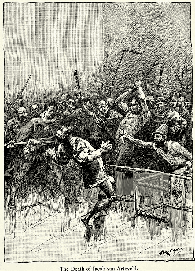 What Van Artevelde didn’t realise was that when the representatives of Ghent returned to the town, they called an assembly of citizens in the town square and told of his proposal to hand Flanders over to the English crown. The mob had already been displeased with Van Artevelde, especially since the weaver takeover. Now they were feeling positively murderous.