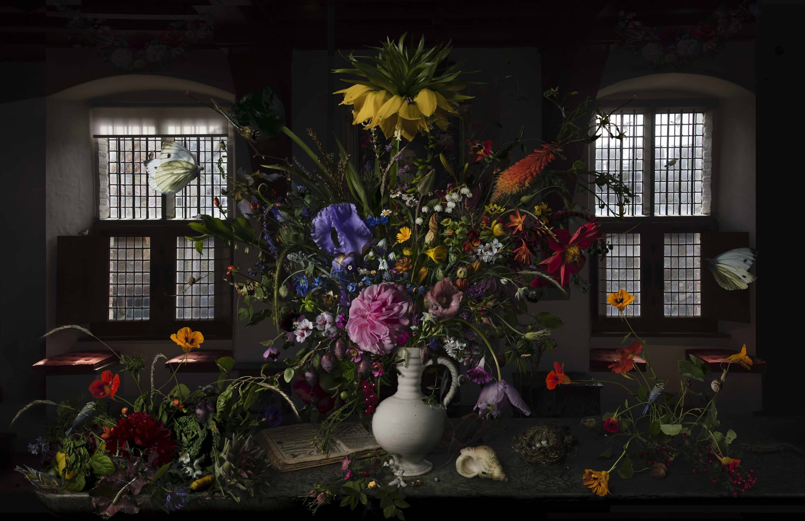 The Sweet Springtime is a work I did on commission for the Rijksmuseum in Muiderslot (a castle near Amsterdam). It is composed of flowers, plants, insects and other animals from the garden of the castle that I catalogued over a whole year. The interior, the tables, vase and windows are original to Muiderslot.