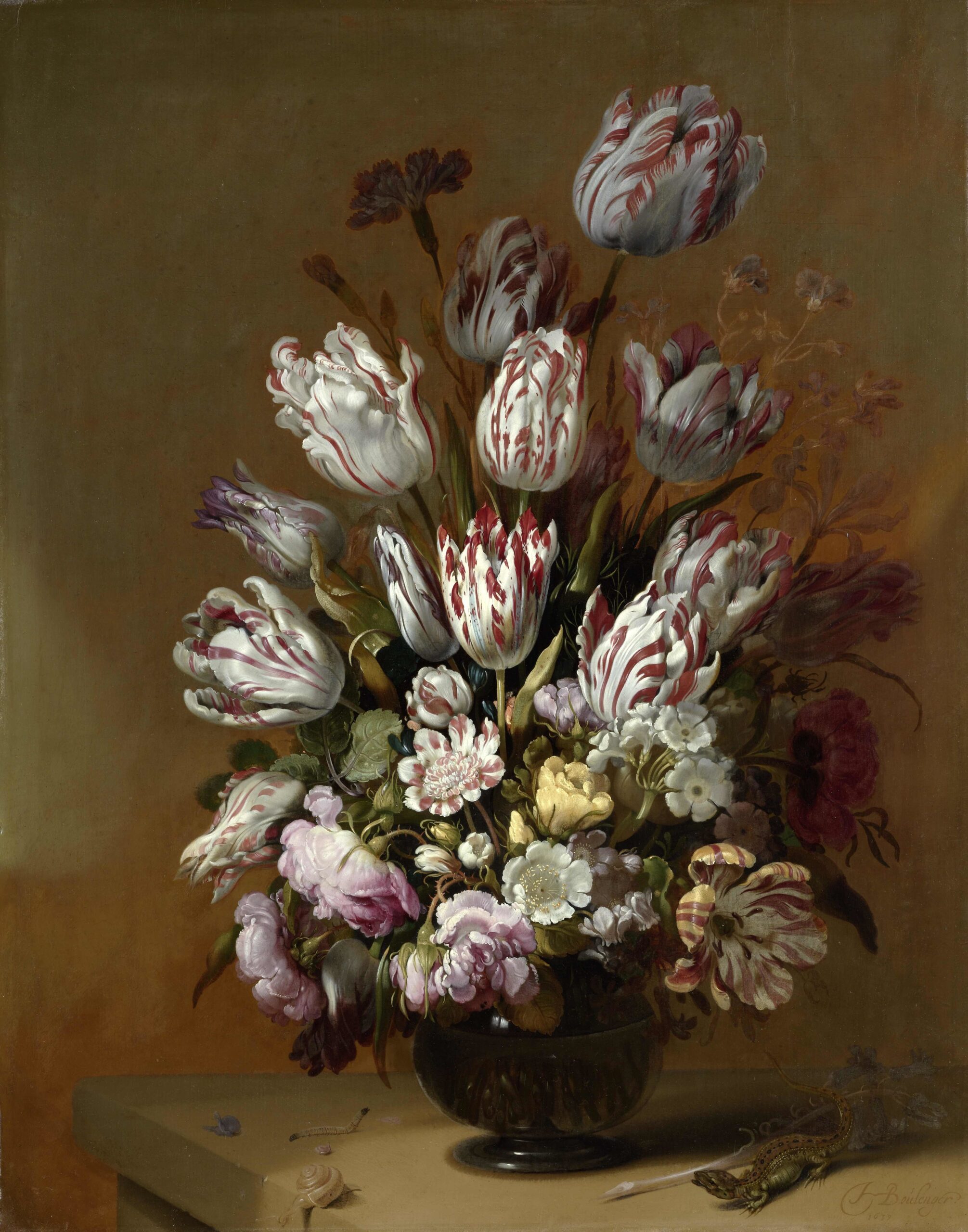 Hans Bollongier was primarily known for his floral arrangements, in which tulips took pride of place. The Dutch painters often chose to use tulips as the most prominent flowers on their canvases, a choice that was influenced by the immense popularity of the tulip in the 30s of the Golden Age amongst merchants and collectors. Tulips were also often painted with watercolours and these works served as a kind of catalogue allowing buyers to see what they might expect from the tulip bulbs they had purchased.