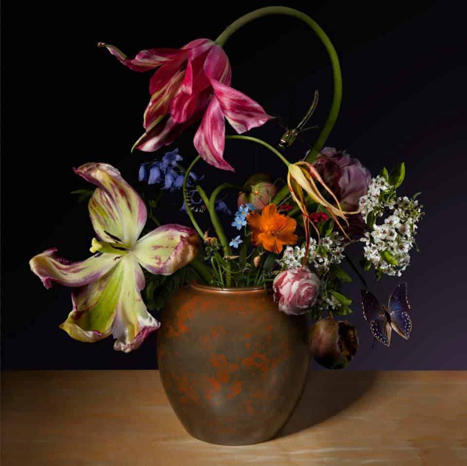 My present-day interpretations of seventeenth-century floral still lifes are all about the lust for observation and my eye for detail. Creating a sense of wonder was very important in the painting of floral still lifes in the Golden Age. Decorative flowers such as tulips are completely normal today and can be found in every garden centre and florist shop, but to the seventeenth-century Dutch viewer, a tulip was an incredibly exotic flower that had only recently been imported into the Netherlands from Islamic Turkey by way of Italy. The seventeenth-century Dutchman was undoubtedly agog at seeing the unknown and unprecedentedly beautiful colours and shapes of those flowers. I want my work to bring back that same sense of wonder.