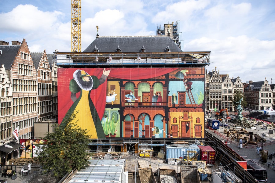 For two years in a row illustrator Fatinha Ramos was presented with a Global Illustration Award at the Frankfurt Book Fair. The Antwerp-based artist with Portuguese roots has put on shows all over the world, has illustrated a children’s book for The Museum Of Modern Art New York (MoMA), and at this very moment, passers-by in Antwerp can enjoy her colourful art work, as it adorns the scaffolding in front of the city hall. Welcome to the surreal worlds of Fatinha Ramos, whose characters’ hair blows with the wind.