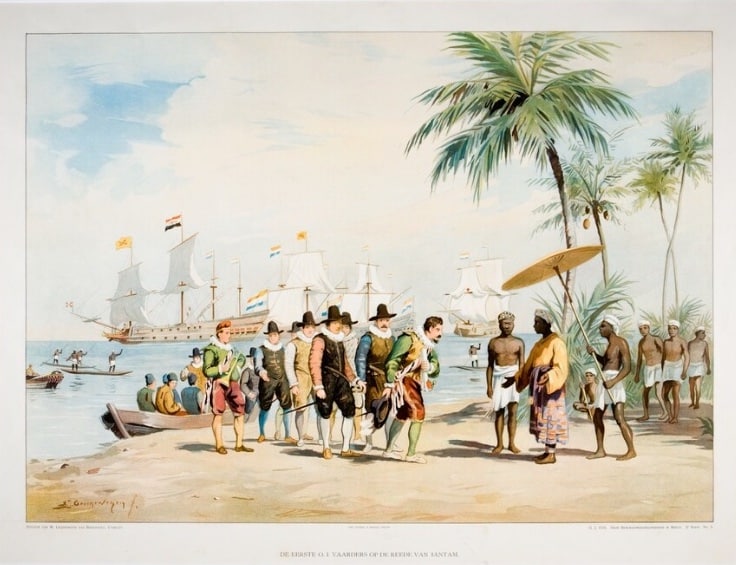 In Dutch and Indonesian textbooks, usually only men (of color and white) are depicted, as in this school poster showing residents of Bantam receiving Dutch colonists. This image appears in Tijd voor Geschiedenis (2022) and Sejarah Indonesia (2014)© Wereldmuseum, Amsterdam