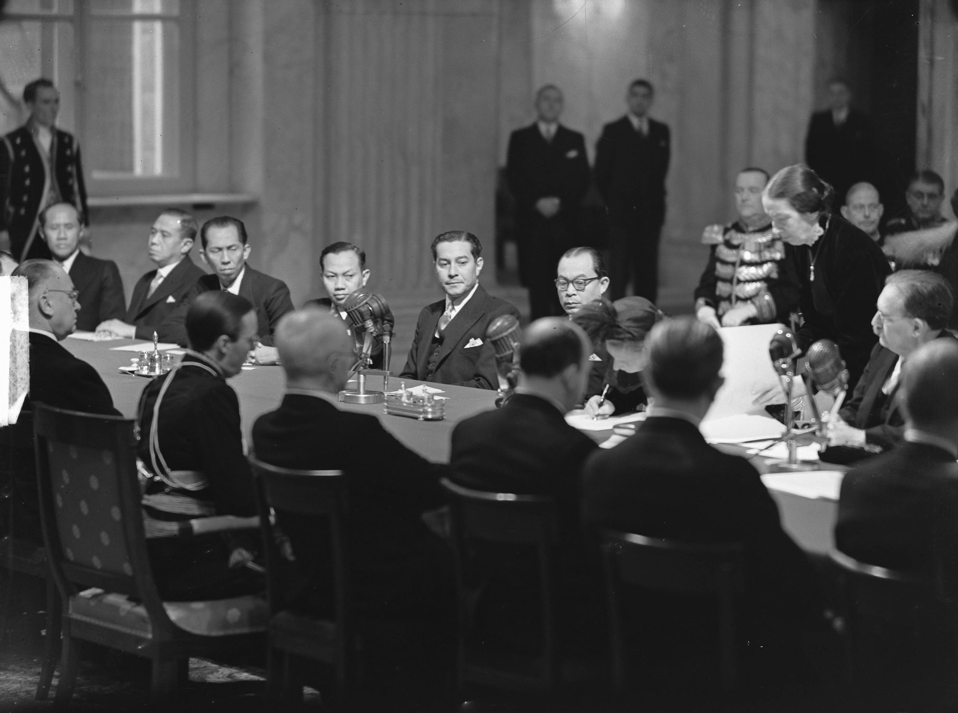 One of the rare white women who appears in textbook images: Queen Juliana signs the transfer of sovereignty. A similar image with a seated Juliana can be found in Time for History (2022)© Nationaal Archief
