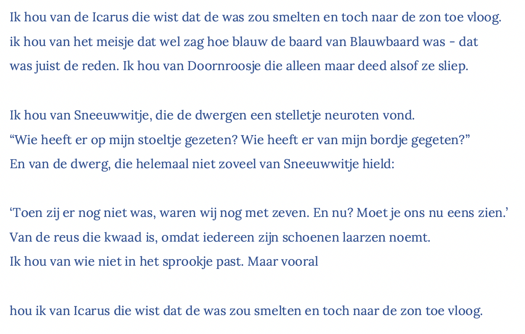 Ons Erfdeel vzw and Poëziecentrum vzw asked nine youngsters from the Low Countries to create poetic films based on their favourite Dutch-language poem. Justine Cappelle (b. 1995, Roeselare) made a film after the poem Ik hou van Icarus (I love Icarus) by Tjitske Jansen, from the anthology Het moest maar eens gaan sneeuwen, published by Podium in 2003. The video poetry project Moving Verses is made possible with the support of the Dutch Foundation for Literature.