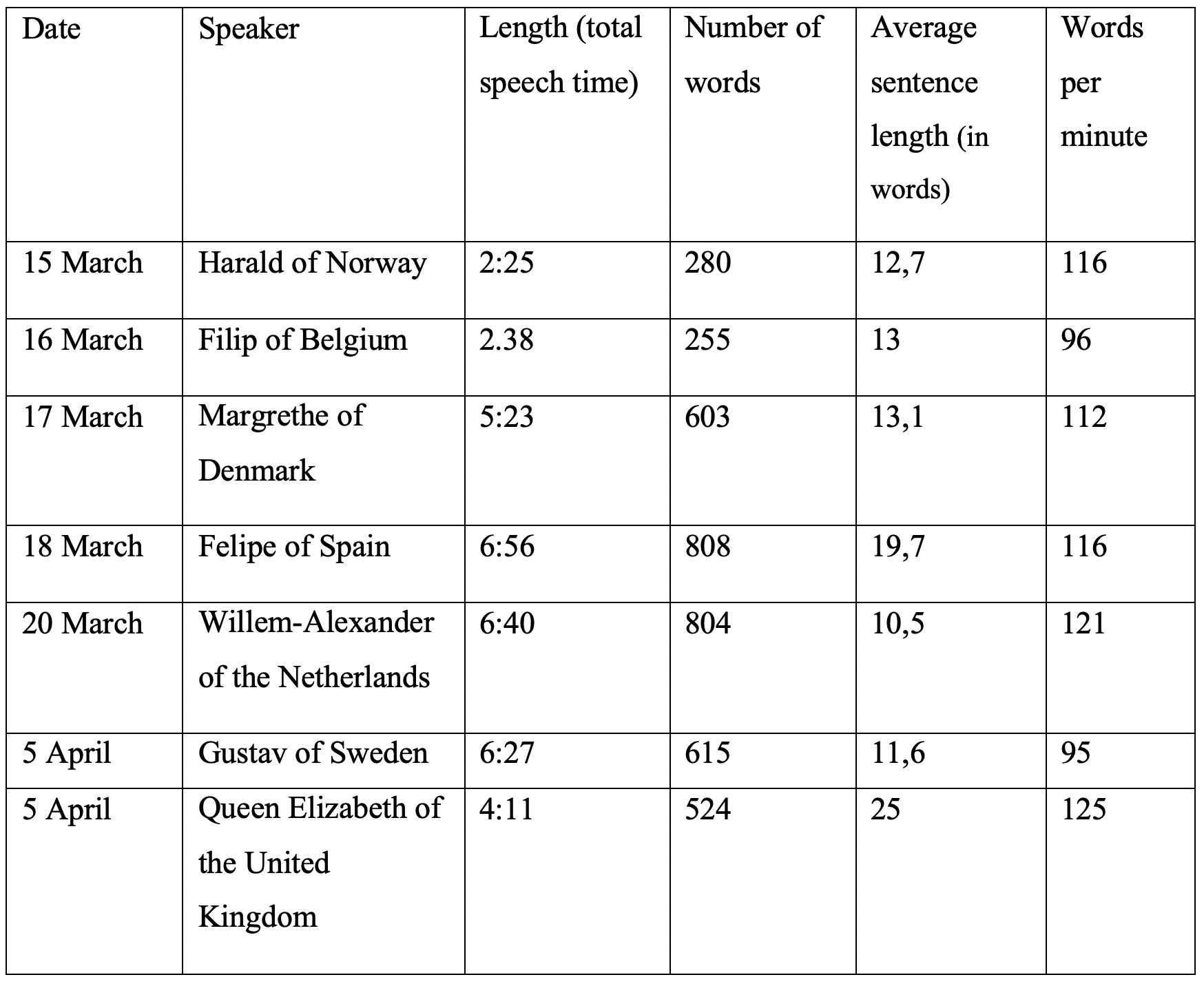 Queen Elizabeth, the oldest monarch at 93, was at first most noticeable by her absence. But then, like Gustav, she broke her silence on 5 April. She presented a text of average length and, without seeming to rush at all, reached the highest speech rate at 125 words per minute. And she set another record: her sentences averaged around 25-words in length, reminiscent of Obama. Long sentences are never recommended by professional speech writers because of the risk of mistakes and improper emphases. Still, she managed to get her long sentences out in a genuine and fluent manner.