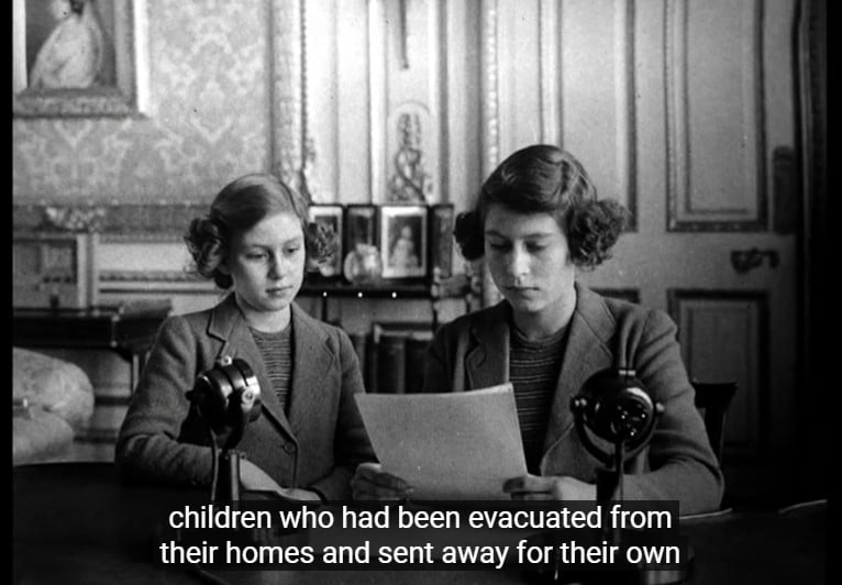 Queen Elizabeth and her sister in 1944.She did this through a controlled and concerned presentation that was interspersed three times – under the guidance of her director – with attention-getting and emotional images of hardworking nursing staff, transport workers, citizens standing outside applauding the heroes of the moment, children’s colourful rainbow drawings and, finally, a proven visual prop: a photo of herself when she and her sister gave a radio address from Windsor Castle in 1944. Everyone can draw the same conclusion: just like they did in wartime, Great Britain and her queen will come through this crisis.