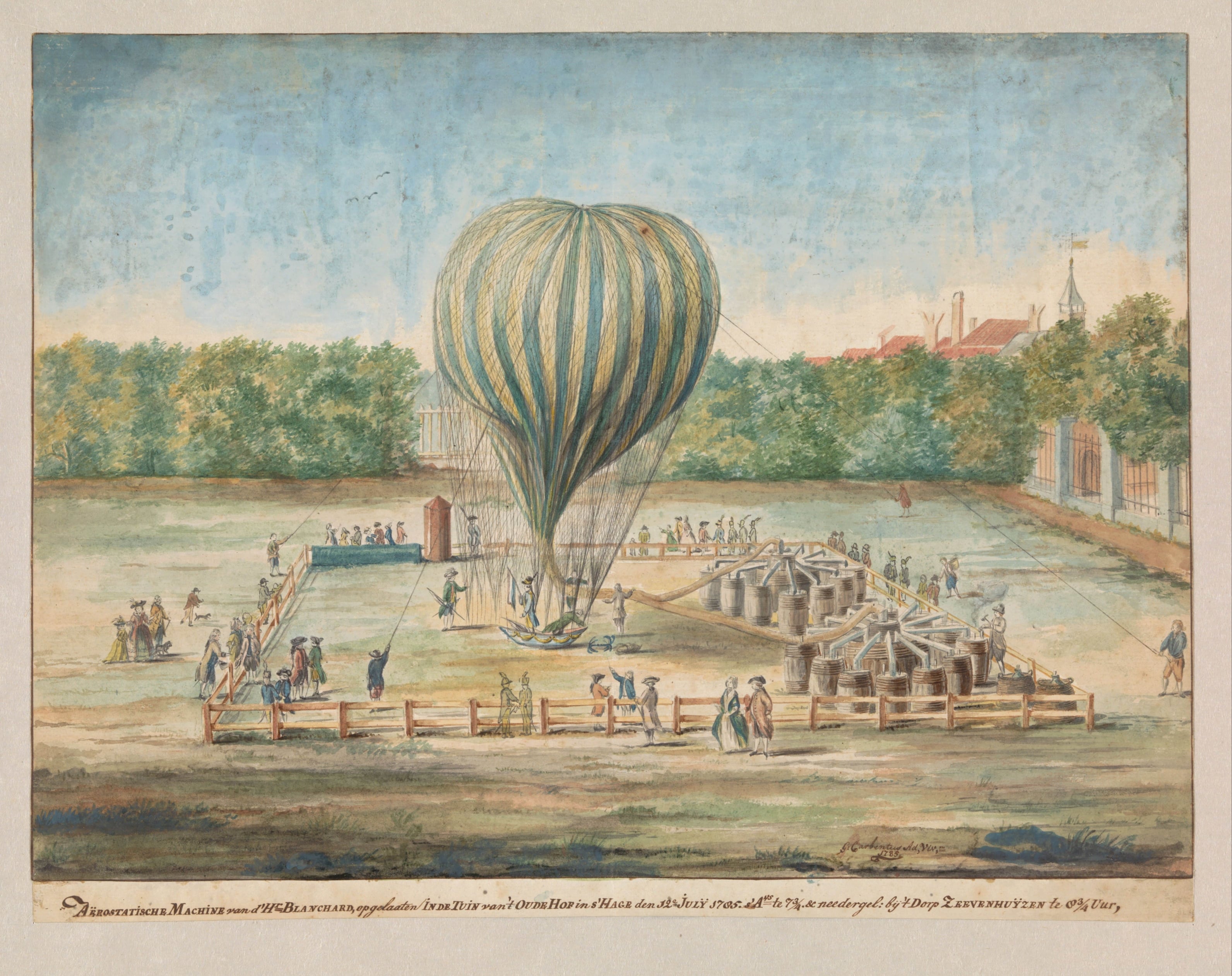 In 1783, the French Montgolfier brothers had invented the hot air balloon, turning a centuries-old dream of inventors and scientists into reality – humans could fly! In the years that followed, all of Europe was captivated by the “air balloon”, a symbol of the Enlightenment’s belief in the power of progress to improve human society. The physics department of Felix Meritis decided to construct a balloon of their own. In May 1784, the members were to give a demonstration outside the Weesperpoort. That day, around eighty thousand Amsterdammers left the city to witness the spectacle with their own eyes. A small balloon managed to take off, but the larger one repeatedly crashed to the ground.